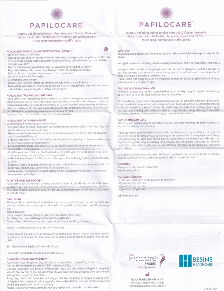 - Không có dữ liệu về việc sử dụng Papilocare® kết hợp với các biện pháp tránh thai âm đạo (ví dụ: Vòng âm đạo, bao cao su nữ), vì vậy không nên sử dụng Papilocare® cho những phụ nữ đang áp dụng loại biện pháp tránh thai này.