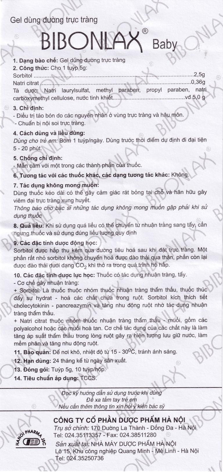 Gel dùng đường trực tràng Bibonlax Baby Hanoi Pharma điều trị táo bón (10 ống x 5g)SẢN PHẨM