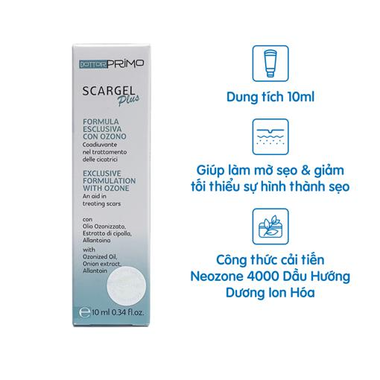 DottorPrimo Scargel Plus là gel dưỡng da với Công nghệ tiên tiến Neozone 4000 (Ozone Hóa Dầu Hướng Dương) được chứng minh có khả năng hỗ trợ làm sạch, giúp làm dịu da, và góp phần cải thiện tình trạng da tổn thương. Sản phẩm giúp dưỡng da, cung cấp độ ẩm cho da, hỗ trợ làm mờ sẹo, mang lại làn da mịn màng