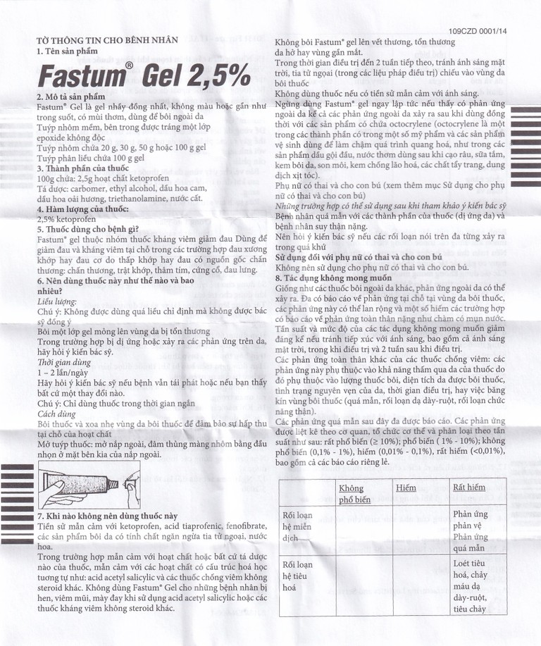 Fastum gel thuộc nhóm thuốc kháng viêm giảm đau. Dùng để giảm đau và kháng viêm tại chỗ trong các trường hợp đau xương khớp hay đau cơ do thấp khớp hay đau có nguồn gốc chấn thương: Chấn thương, trật khớp, thâm tím, cứng cổ, đau lưng.