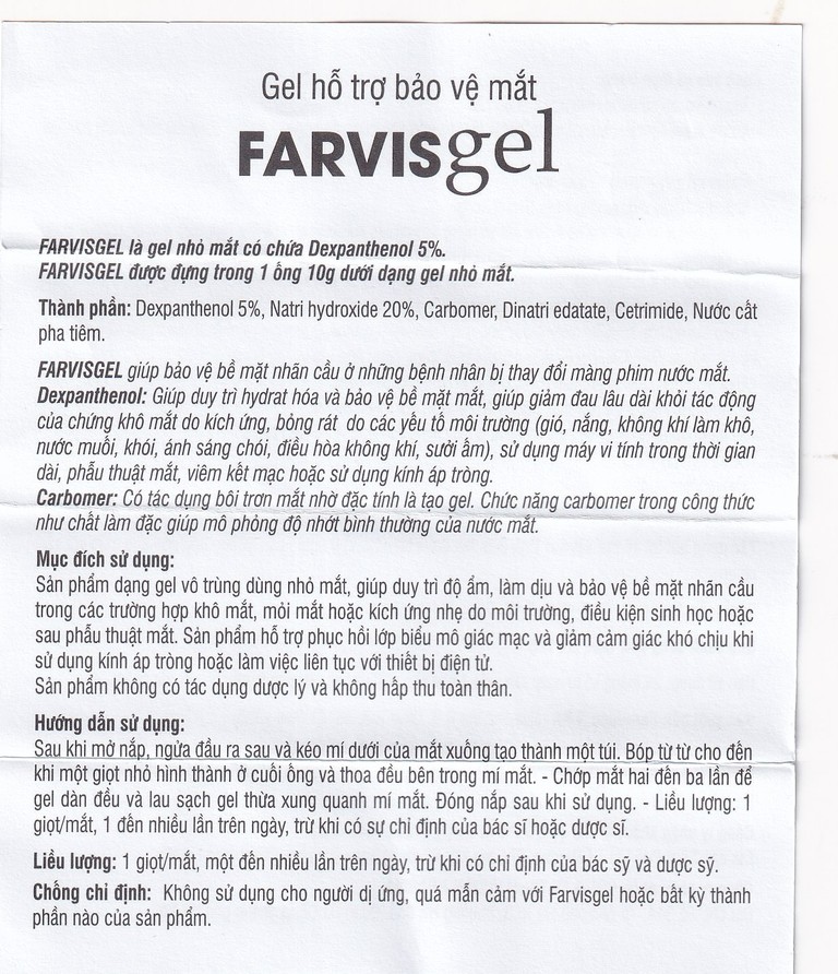 Chống chỉ định: Không sử dụng cho người dị ứng, quá mẫn cảm với FARVISgel hoặc bất kỳ thành phần nào của sản phẩm.