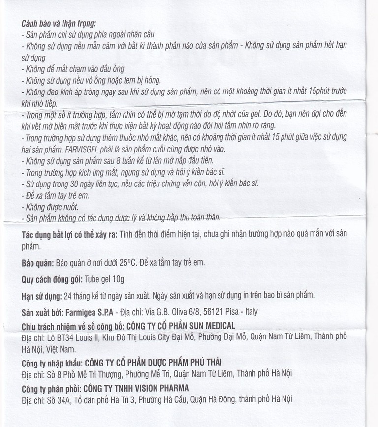 - Trong trường hợp sử dụng thêm thuốc nhỏ mắt khác, nên có khoảng thời gian ít nhất 15 phút giữa việc sử dụng hai sản phẩm. FARVISgel phải là sản phẩm cuối cùng được nhỏ vào.
