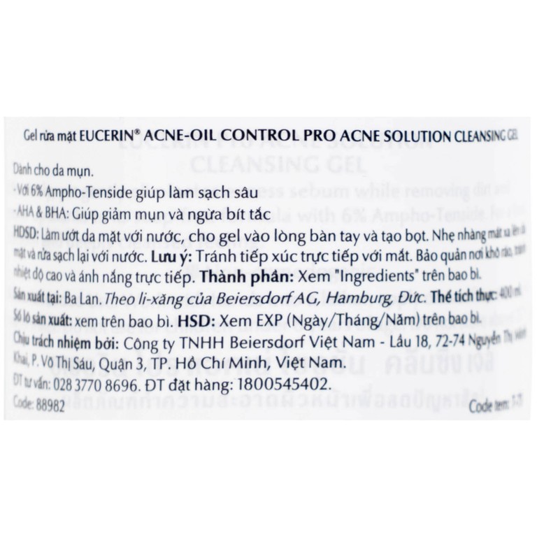 Gel rửa mặt Eucerin Pro Acne Cleansing Gel dành cho da mụn. Với 6% Ampho-Tenside giúp làm sạch sâu. AHA và BHA: Giúp giảm mụn và ngừa bít tắc.