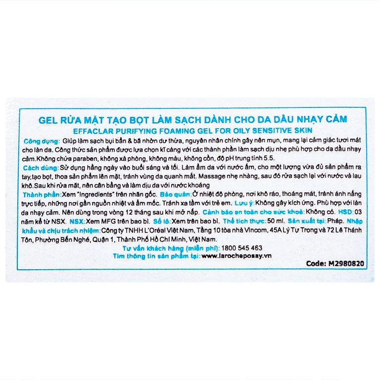 Gel rửa mặt tạo bọt La Roche-Posay Effaclar làm sạch cho da dầu nhạy cảm (50ml)SẢN PHẨM