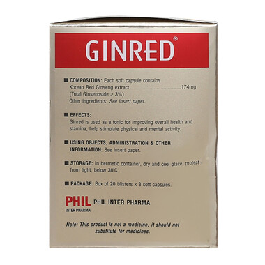 Ginred là thực phẩm chức năng hỗ trợ tăng cường sinh lực, bồi bổ nguyên khí, giúp cơ thể tràn đầy năng lượng và nâng cao sức khỏe tổng thể. Với thành phần chính là cao hồng sâm Triều Tiên, sản phẩm giúp cải thiện thể lực, tăng cường sinh lý, giải tỏa căng thẳng và giúp tinh thần tỉnh táo. Ginred phù hợp với người suy nhược cơ thể, căng thẳng, mệt mỏi và cần bổ sung năng lượng để làm việc hiệu quả hơn.