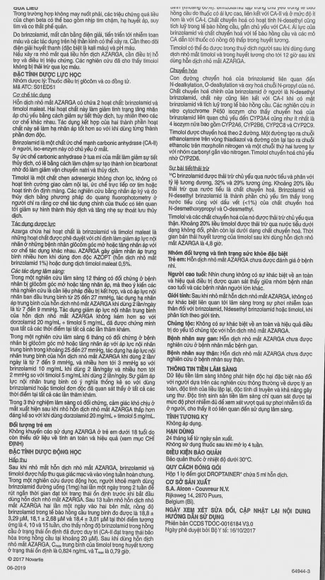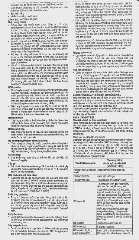 - Hấp thu: Sau khi nhỏ mắt hỗn dịch nhỏ mắt Azarga, hoạt chất brinzolamid và timolol được hấp thu qua giác mạc và vào vòng tuần hoàn chung.