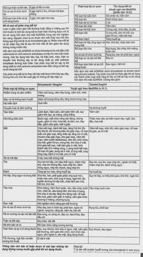 - Brinzolamid và timolol được hấp thu toàn thân. Do thành phần timolol có tác dụng chẹn beta-adrenergic, có thể xảy ra các tác dụng không mong muốn trên tim mạch, phổi và các tác dụng không mong muốn khác giống như quan sát thấy với các thuốc chẹn beta-adrenergic dùng đường toàn thân.