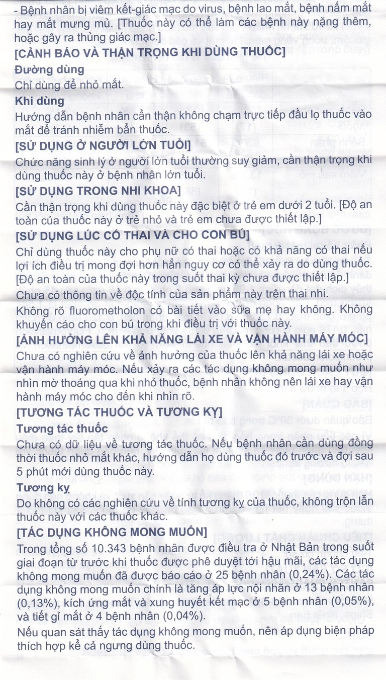 Không rõ fluorometholon có bài tiết vào sữa mẹ hay không. Không khuyến cáo cho con bú trong khi điều trị với thuốc này.