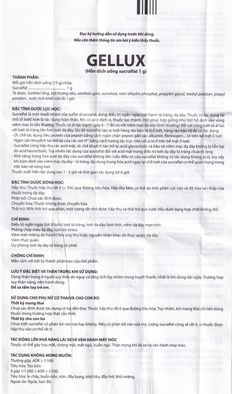 Dưới 12 tuổi: Liều chỉ định không phù hợp với dạng bào chế của Gellux 1g.
