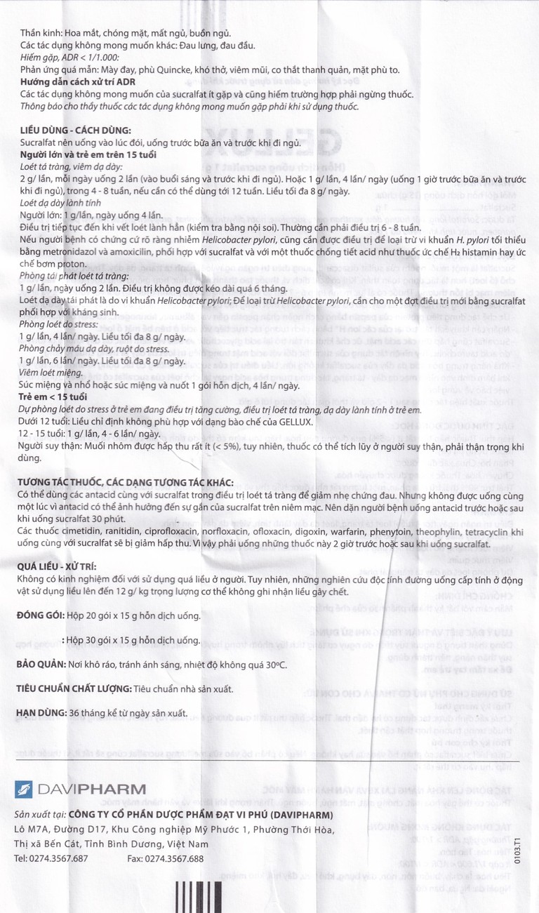 Hỗn dịch uống Gellux 1g Davipharm điều trị ngắn ngày loét tá tràng, dạ dày lành tính (20 gói x 15g)SẢN PHẨM