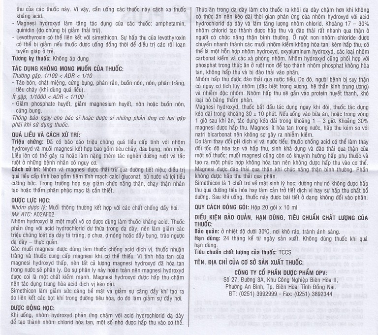 Triệu chứng: Đã có báo cáo triệu chứng quá liều cấp tính với nhôm hydroxyd và muối magnesi kết hợp bao gồm tiêu chảy, đau bụng, nôn mửa.