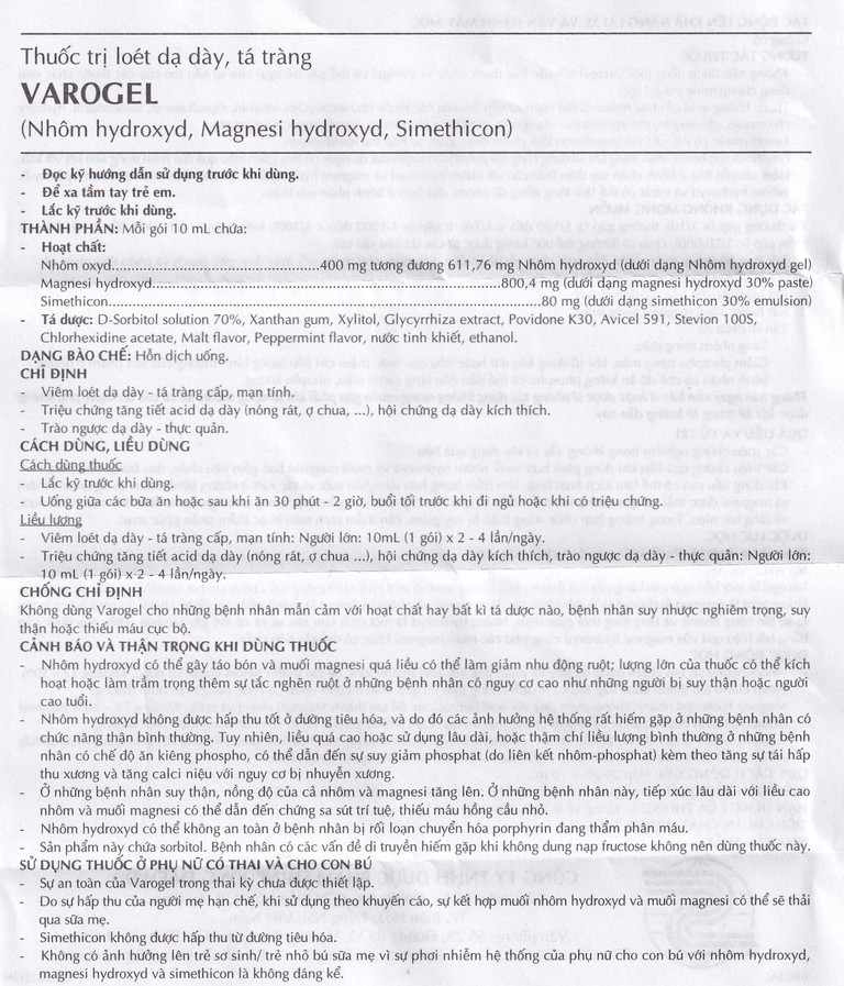 Varogel nói chung không có tác dụng phụ táo bón hay tiêu chảy nhờ sự phối hợp hài hòa giữa nhôm và magnesi hydroxid.