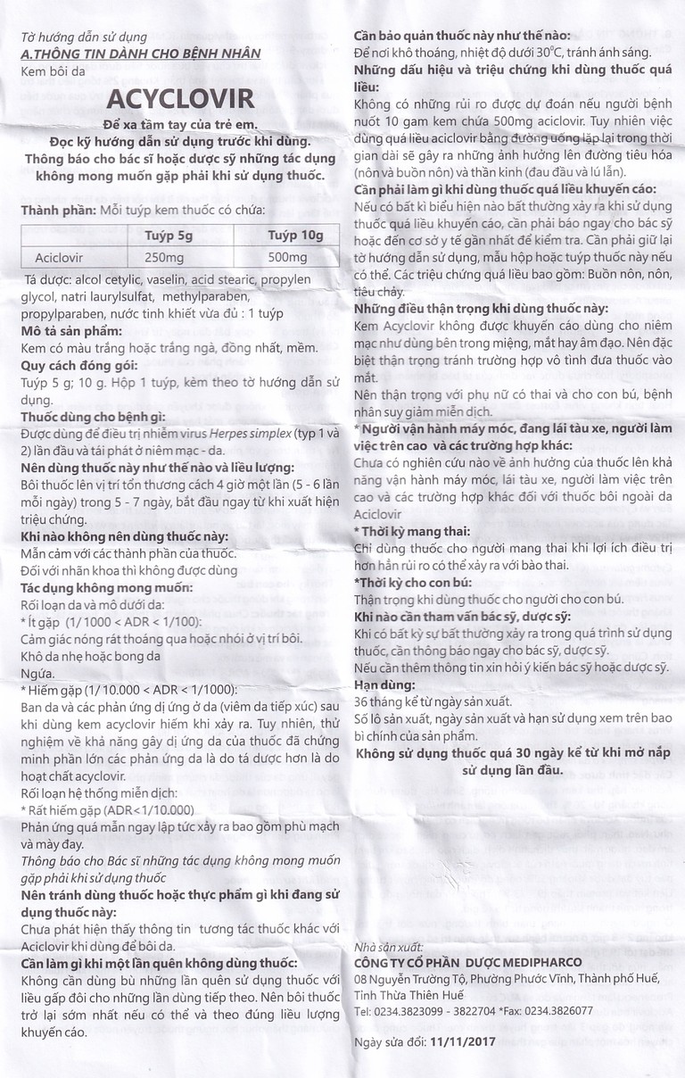 Kem bôi da Acyclovir Medipharco điều trị nhiễm virus Herpes simplex (5g)