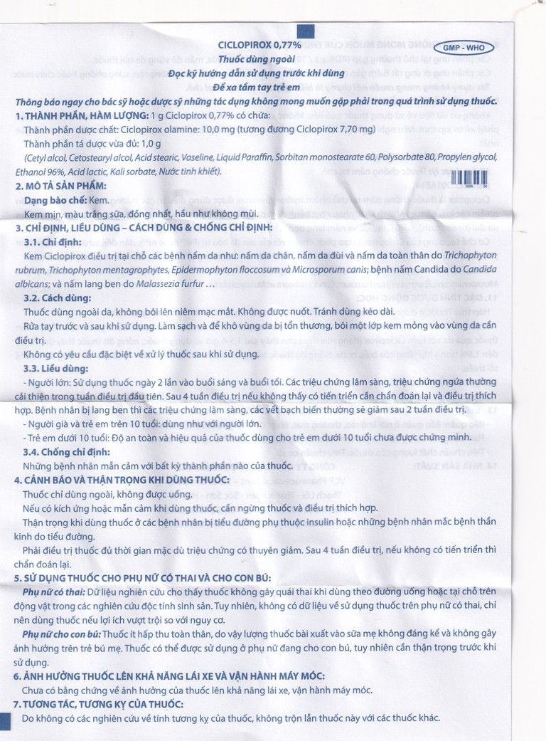 Kem bôi da Ciclopirox 0,77% dùng ngoài da, không bôi lên niêm mạc mắt. Không được nuốt. Tránh dùng kéo dài.
