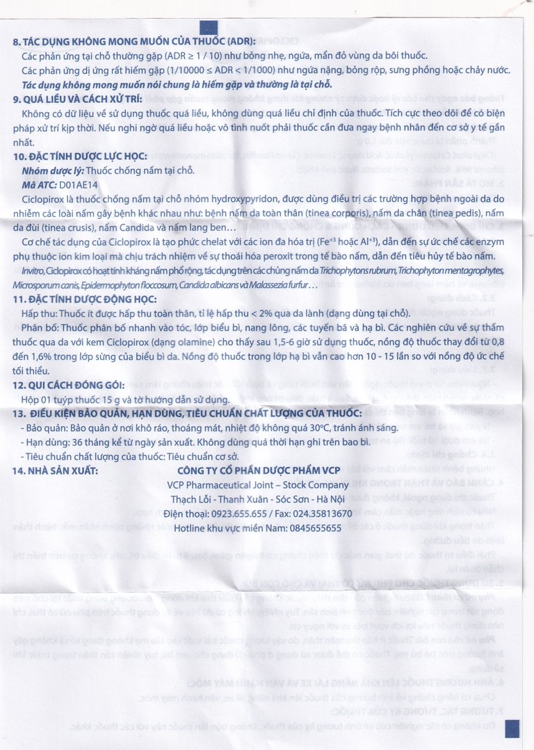 Kem bôi da Ciclopirox 0,77% VCP điều trị nấm da chân, nấm da đùi và nấm da toàn thân (15g)SẢN PHẨM