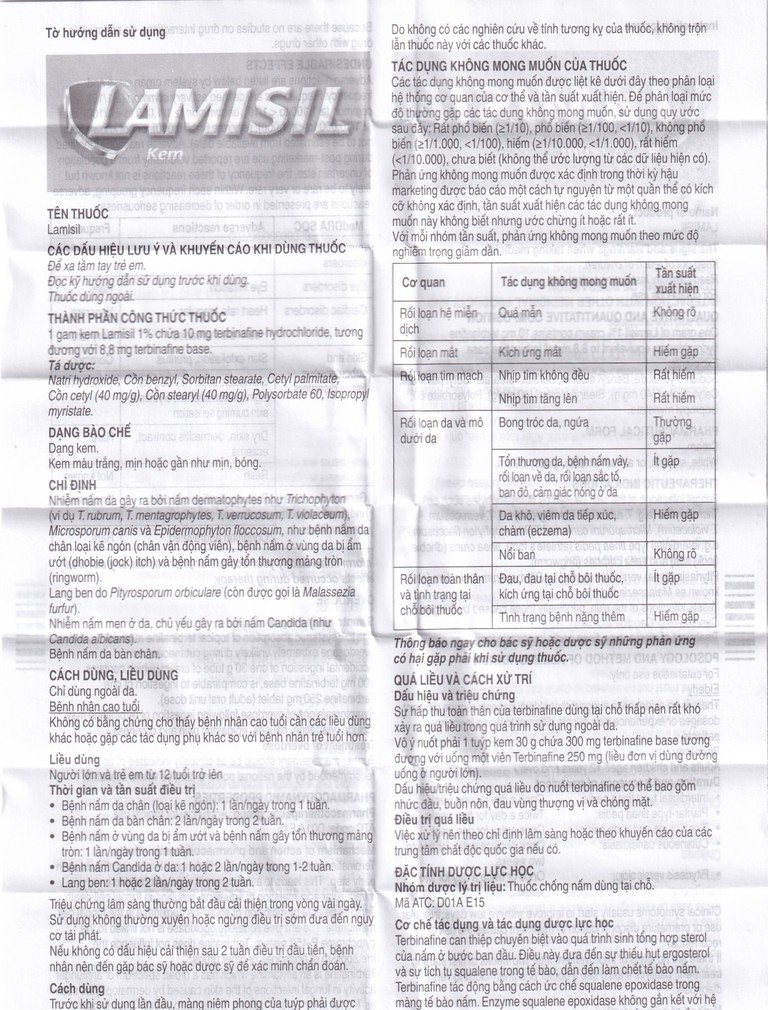 Vô ý nuốt phải 1 tuýp kem Lamisil 30g chứa 300mg terbinafine hydrochloride tương đương với uống một viên Lamisil 250mg (liều đơn vị dùng đường uống ở người lớn). Những tác dụng bất lợi này bao gồm nhức đầu, buồn nôn, đau vùng thượng vị và chóng mặt.
