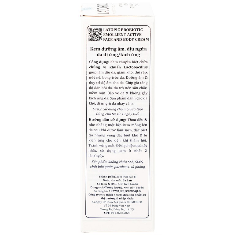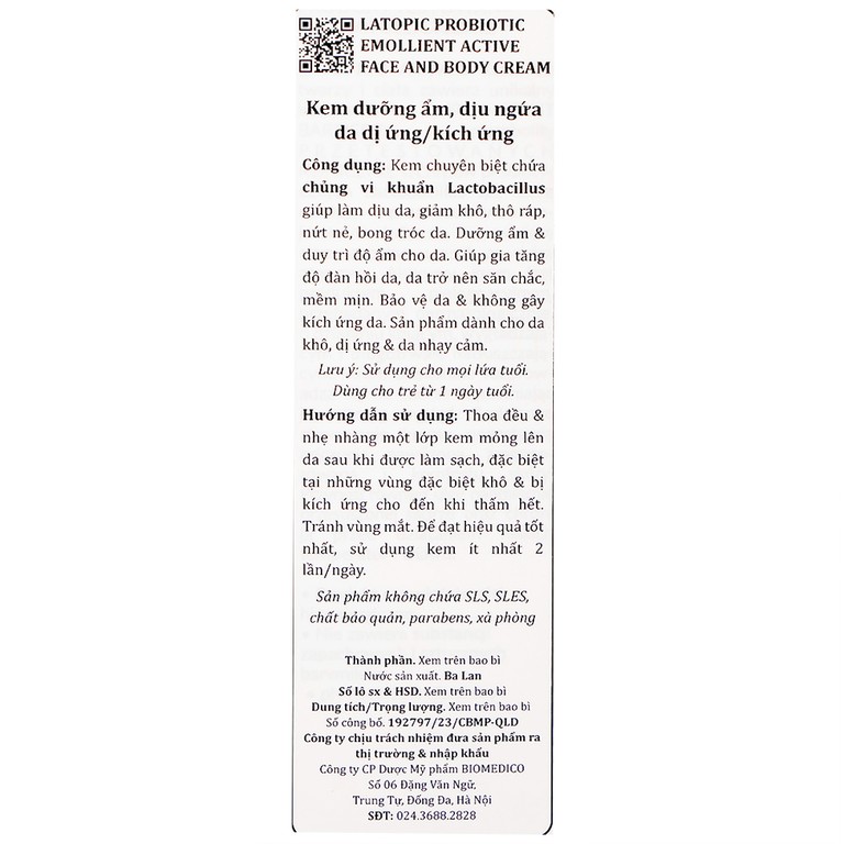 Khi làn da trở nên khô ráp, bong tróc và nhạy cảm, đặc biệt là ở trẻ nhỏ, việc tìm kiếm một sản phẩm dịu nhẹ, lành tính để chăm sóc hàng ngày là điều vô cùng quan trọng. Kem bôi Latopic Probiotic Emollient Active Face and Body Cream là sản phẩm được thiết kế chuyên biệt giúp làm dịu da, dưỡng ẩm và bảo vệ làn da dễ kích ứng, phù hợp với cả trẻ sơ sinh từ 1 ngày tuổi trở lên.