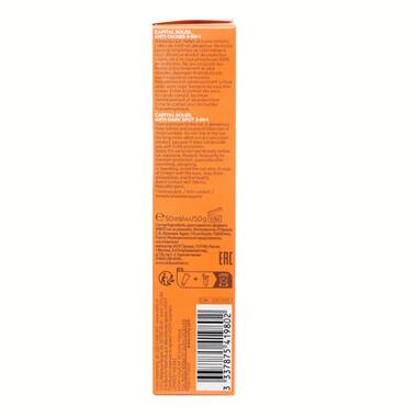 Kem Chống Nắng Vichy Capital Soleil Anti-Dark Spot 3-In-1 SPF50+ là sản phẩm chống nắng da mặt 3 trong 1 mới từ thương hiệu dược mỹ phẩm Vichy dành cho tình trạng da sạm, xỉn màu, đốm sắc tố. Công thức sử dụng màng lọc chống nắng tối ưu giúp bảo vệ da trước tia UVA và UVB, cùng thành phần chính từ Phe-Resorcinol và nước khoáng núi lửa Vichy nuôi dưỡng da hiệu quả, ngăn ngừa sạm da, giảm thâm nám. Sản phẩm có màu nhẹ giúp che phủ khuyết điểm tự nhiên.
