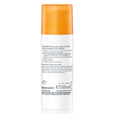 Eucerin Sun Dry Touch Oil Control Face SPF50+ PA+++ tiên tiến với công nghệ Spectral quang phổ rộng tạo nên lá chắn hoàn hảo cho da, ngăn chặn tác hại từ tia UVA/UVB và ánh sáng xanh. Đồng thời, kết hợp Carnitine và Licochalcone A lần lượt mang đến sức mạnh kiểm soát bã nhờn trong suốt 8 giờ, hạn chế bít tắc lỗ chân lông giúp da thông thoáng và ngăn ngừa mụn.