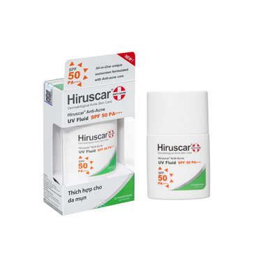 Hiruscar Anti-Acne UV Fluid SPF50 PA++++, kem chống nắng ngăn ngừa mụn có công thức độc đáo dành riêng cho làn da mụn hoặc dễ bị mụn bằng cách cung cấp khả năng chống nắng cao bảo vệ da khỏi các tia UVA và UVB có hại đồng thời giảm các vấn đề về mụn.