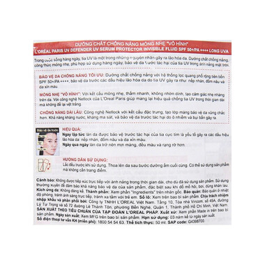 Kem Chống Nắng L’Oreal Paris UV Defender Serum Invisible Resist SPF50+ PA++++ x20 Mỏng Nhẹ sở hữu màng bảo vệ UV mạnh mẽ, giúp cản nắng tối đa nhưng vẫn nhẹ nhàng trên da. Với chỉ số chống nắng SPF50+ và khả năng chống lại tia UVA dài, sản phẩm giúp hỗ trợ bảo vệ da khỏi các dấu hiệu lão hoá do tia UV gây ra như: đốm nâu, da xỉn màu và nếp nhăn.