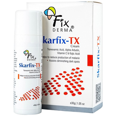 Fixderma Skarfix-TX Cream là một phương pháp mới trong điều trị nám và da không đều màu. Một sản phẩm mang đến hiệu quả mạnh mẽ trong việc làm giảm sự xuất hiện của nám, PIE, PIH và tăng sắc tố. Với sức mạnh của Tranexamic ức chế sự chuyển giao melanin với hiệu quả tuyệt vời và tác dụng hiệp đồng bởi axit Kojic, alpha arbutin và vitamin E.