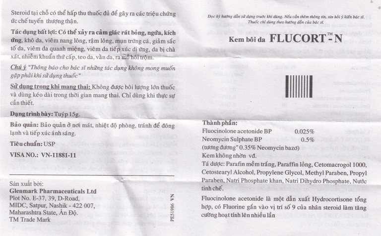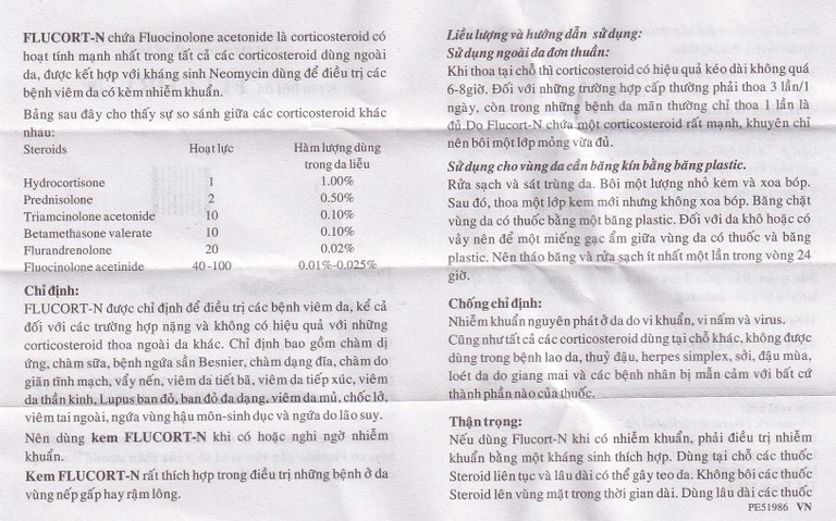 Flucort-N chứa fluocinolone acetonide là corticosteroid có hoạt tính mạnh nhất trong tất cả corticosteroid dùng ngoài da, được kết hợp với kháng sinh neomycin dùng để điều trị các bệnh viêm da có kèm nhiễm khuẩn.