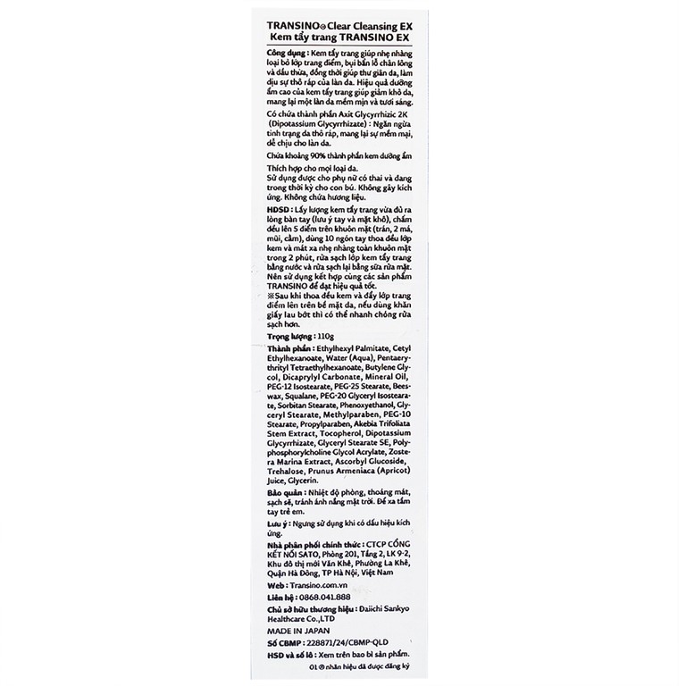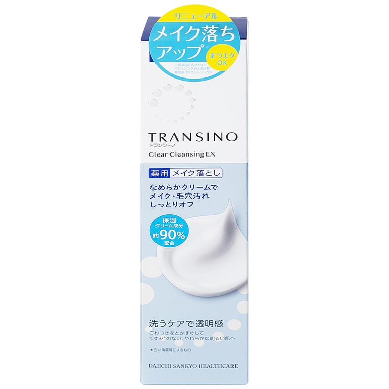 Transino Clear Cleansing EX là kem tẩy trang đến từ Nhật Bản, được thiết kế để vừa làm sạch trang điểm và bụi bẩn, vừa giúp giữ ẩm, hạn chế tình trạng khô da sau khi rửa mặt. Sản phẩm chứa khoảng 90% thành phần dưỡng ẩm, sử dụng được cho phụ nữ có thai và đang trong thời kỳ cho con bú. Không gây kích ứng. Không chứa hương liệu.