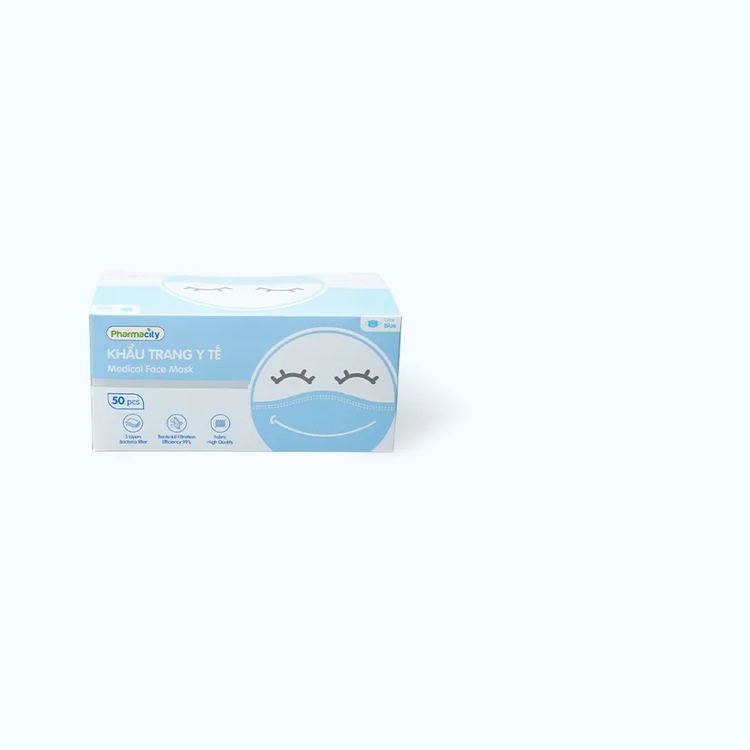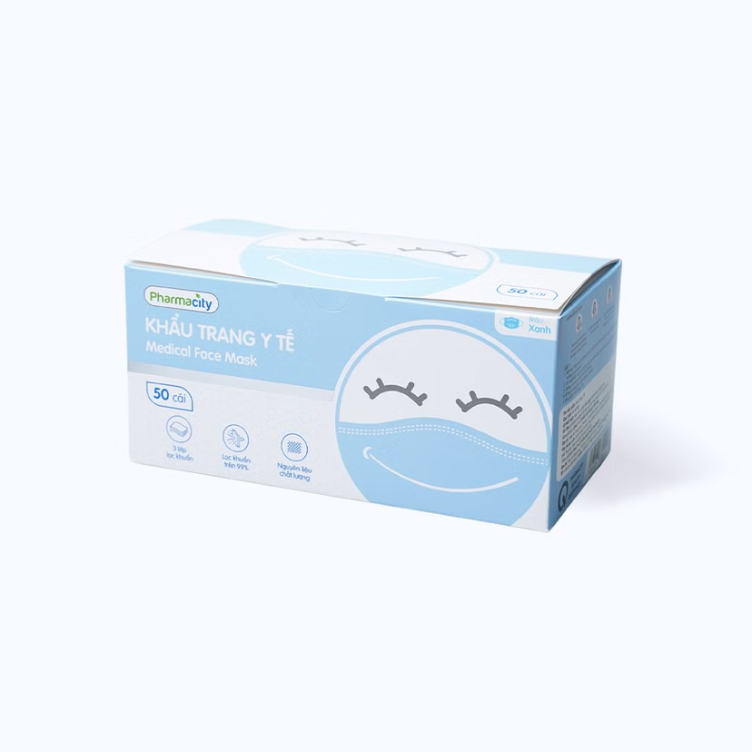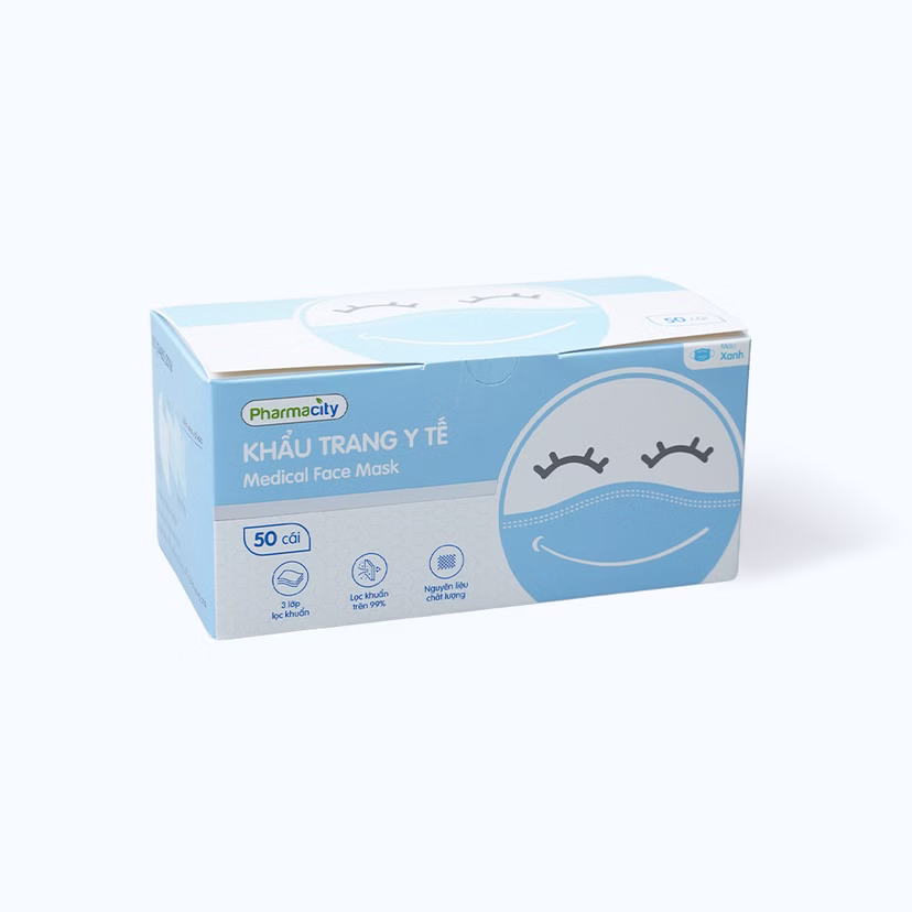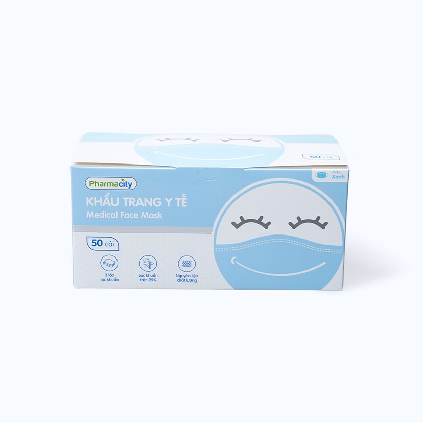 Khẩu trang y tế 3 lớp màu xanh Pharmacity bảo vệ khỏi vi khuẩn, khói và bụi mịn (50 cái/hộp)SẢN PHẨM