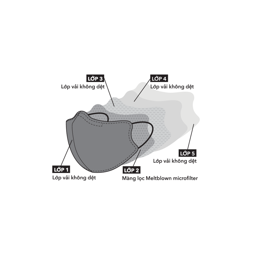 - Các lớp vải gồm: lớp ngoài và lớp trong là lớp vải không dệt, lớp giữa là lớp vi lọc.