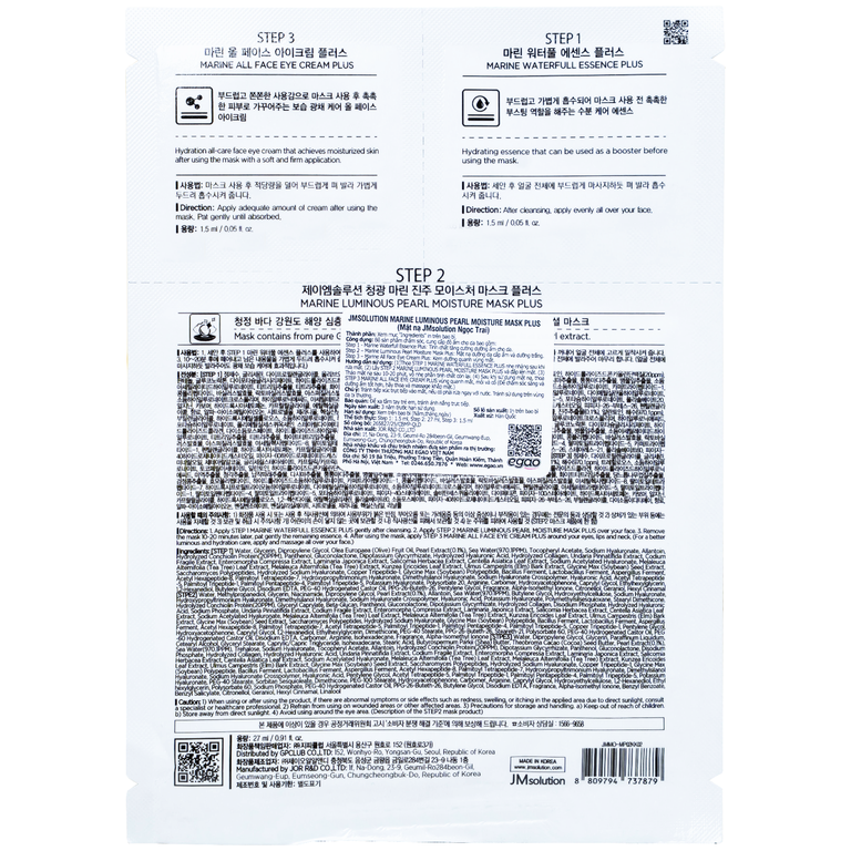 JMsolution Marine Luminous Pearl Moisture Mask Plus chăm sóc toàn diện 3 bước, mang lại làn da ẩm mịn và tươi sáng sau một ngày dài. Bộ mặt nạ tích hợp gồm tinh chất dưỡng, mặt nạ dưỡng và kem vùng mắt giúp chăm sóc da bài bản ngay tại nhà mà không tốn nhiều thời gian.