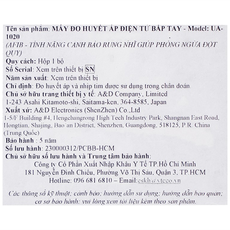 Máy đo huyết áp bắp tay tự động AND UA-1020 đo huyết áp, cảnh báo đột quỵ