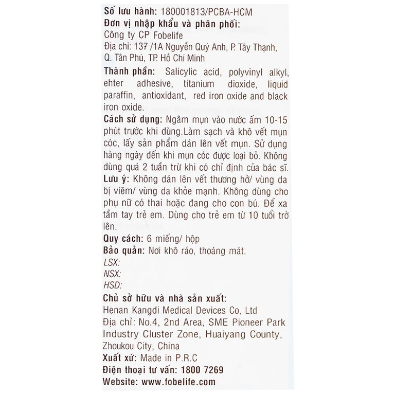 Miếng dán mụn cóc Fobelife được sản xuất từ Henan Kangdi Medical Devices Co, Ltd., nhập khẩu và phân phối bởi Công ty CP Fobelife. Công ty CP Fobelife được thành lập vào năm 2016, chuyên về sản xuất và phân phối các sản phẩm thực phẩm bảo vệ sức khỏe, mỹ phẩm và thiết bị y tế có nguồn gốc từ thiên nhiên.