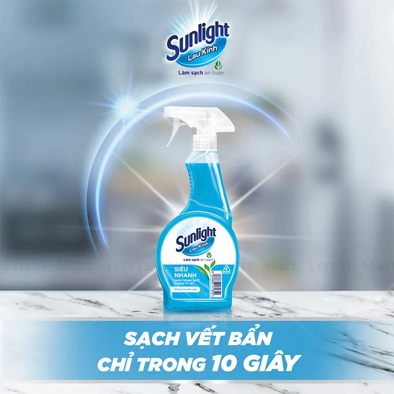 Nước lau kính Sunlight làm sạch các bề mặt kính một cách nhanh chóng và hiệu quả. Sản phẩm không để lại cặn canxi hay vết ố trên kính, giúp giữ cho bề mặt kính luôn trong suốt và không có vệt sọc. Thường được sử dụng để làm sạch cửa sổ, cửa kính, gương và các bề mặt kính khác.