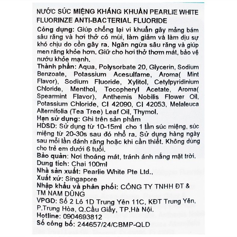 Thành phần của Pearlie White Fluorinze Anti-bacterial Fluoride