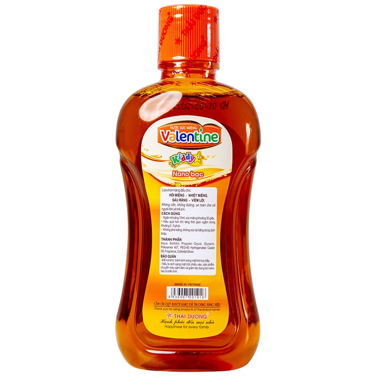 Nước súc miệng Thái Dương Valentine Kiddy hỗ trợ diệt khuẩn, bảo vệ răng miệng (250ml)Răng miệng là một trong những bộ phận quan trọng cần được chăm sóc và bảo vệ một cách tỉ mỉ và thường xuyên. Ngoài việc duy trì thói quen đánh răng đều đặn 2 lần/ngày, sử dụng chỉ nha khoa thì nước súc miệng là một trong những bước không thể bỏ qua.