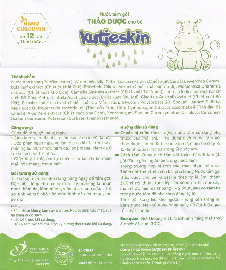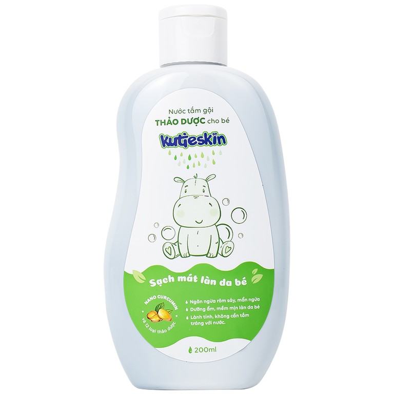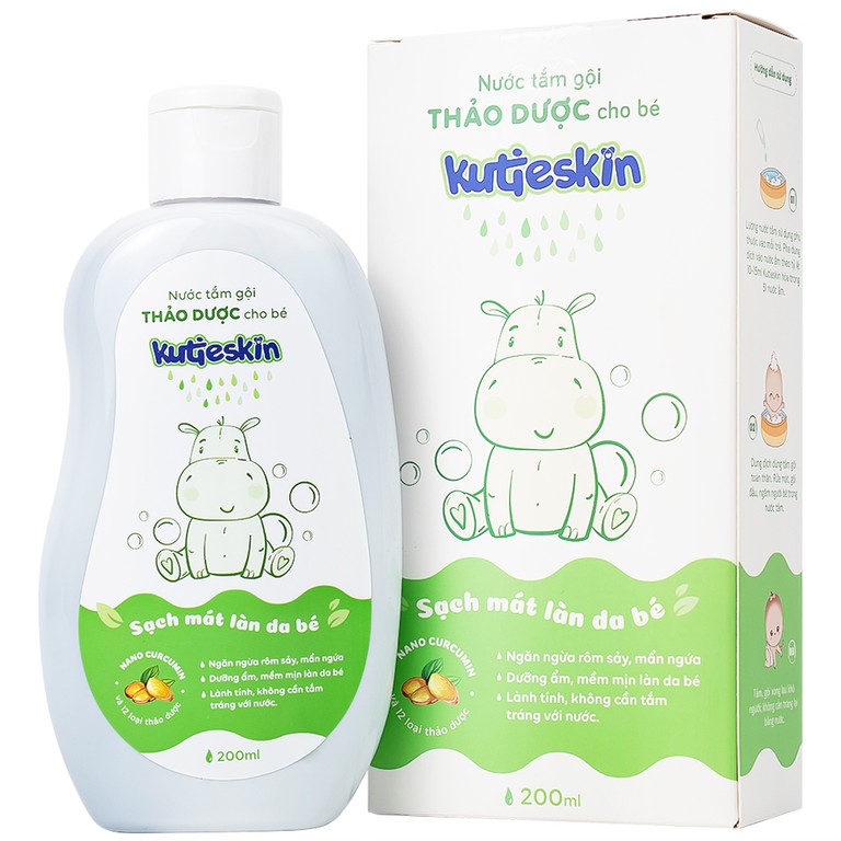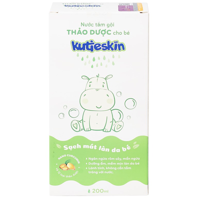 Nước tắm gội thảo dược Kutieskin với chiết xuất Nano Curcumin và 12 loại thảo dược thiên nhiên, giúp làm sạch dịu nhẹ, giữ ẩm và góp phần ngăn ngừa các vấn đề da liễu thường gặp ở trẻ như rôm sảy, mẩn ngứa, hăm tã. Sản phẩm được sản xuất tại Việt Nam, dung tích 200ml, phù hợp sử dụng hằng ngày cho trẻ sơ sinh và trẻ nhỏ.