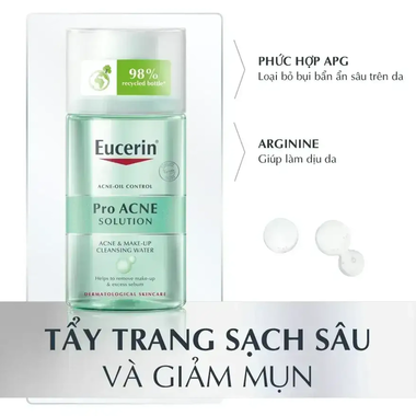 Eucerin Pro Acne là nước tẩy trang phù hợp với mọi loại da, đặc biệt là da mụn nhờn. Sản phẩm có khả năng làm sạch sâu mà vẫn đặc biệt dịu nhẹ cho da, kể cả da nhạy cảm và vùng da mắt.