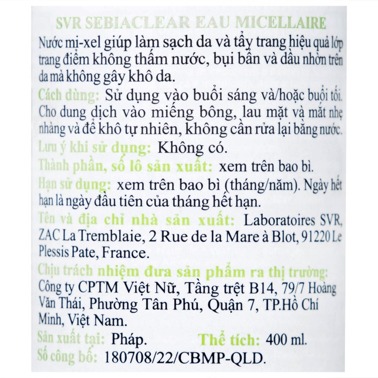 Nước tẩy trang SVR Eau Micellaire Sebiaclear 400ml làm sạch da và tẩy trang lớp trang điểm dành cho da dầu mụnSẢN PHẨM