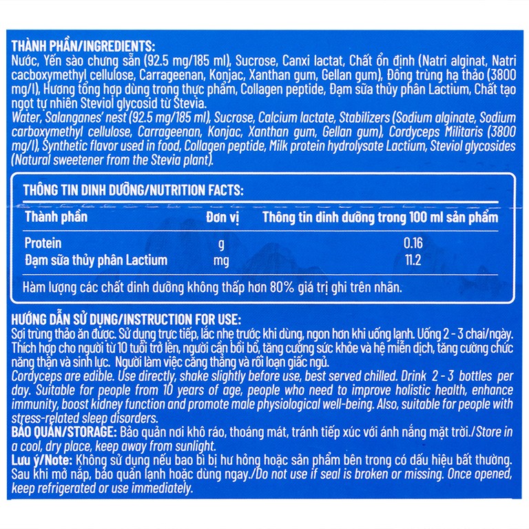 Sợi trùng thảo ăn được. Sử dụng trực tiếp, lắc nhẹ trước khi dùng, ngon hơn khi uống lạnh. Uống 2 – 3 chai/ngày.