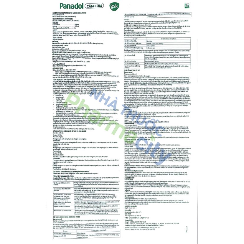 - Hoạt chất: Paracetamol 500mg, Caffeine 25mg, Phenylephrine hydrochloride 5mg.