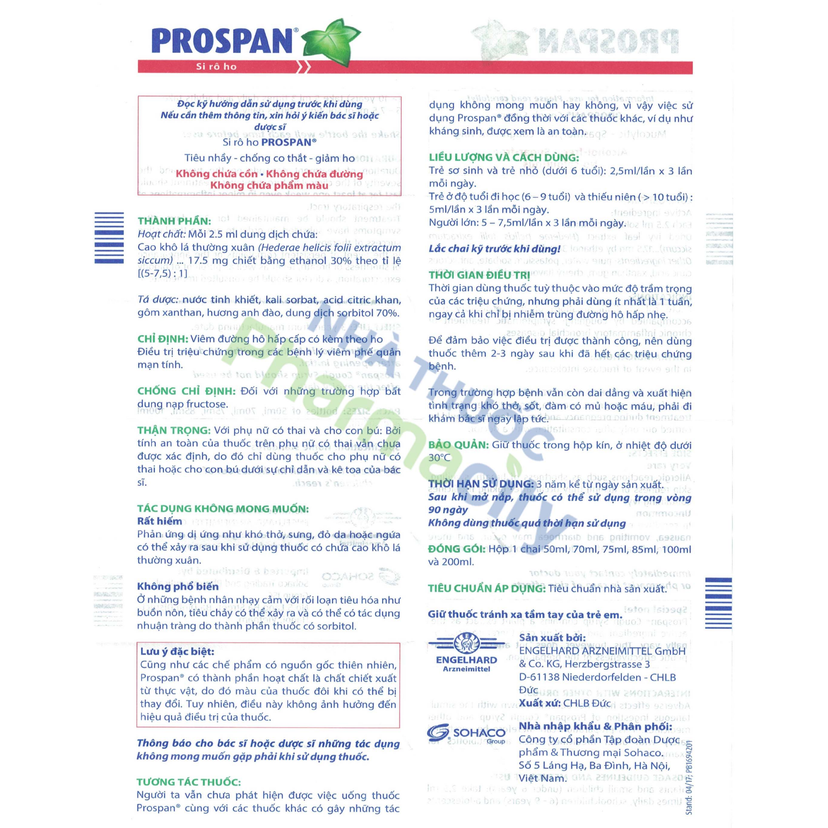 - Hoạt chất: Chai 100ml: Cao khô lá thường xuân (Hederae helicis folii extractum siccum) 0.7g, Chiết bằng ethanol 30% theo tỉ lệ [(5-7.5): 1]