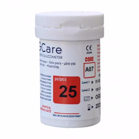Que thử đường huyết Ogcare (25 que) là sản phẩm que thử dùng cho các dòng máy đo đường huyết Ogcare, có thời hạn sử dụng lâu, đảm bảo an toàn vệ sinh y tế. Sản phẩm phù hợp với máy đo đường huyết Ogcare.