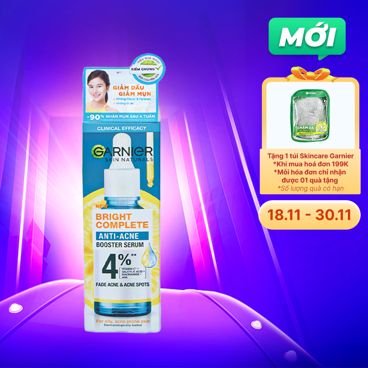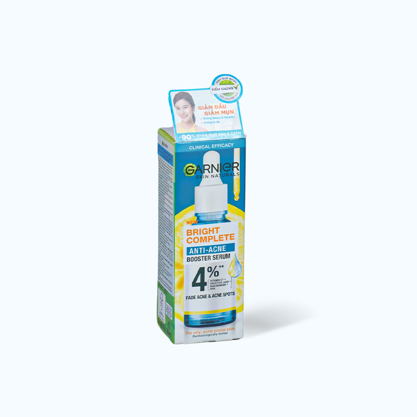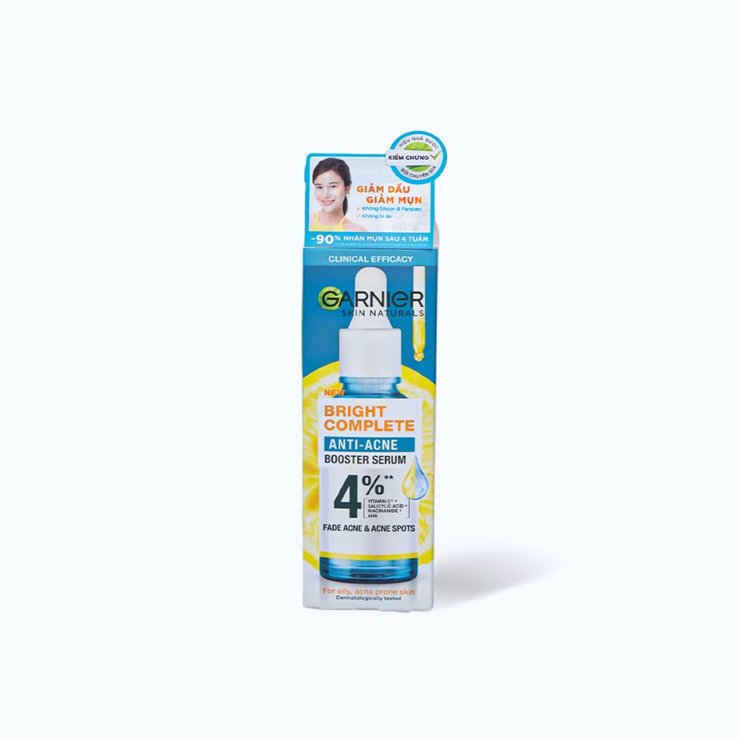 Tinh chất giảm mụn sáng da Garnier Skin Naturals Bright Complete Anti-Acne Booster Serum với công thức 4% [Vitamin C + BHA Salicylic + Niacinamide + AHA] giúp giảm mụn và làm giảm vết thâm sau mụn.