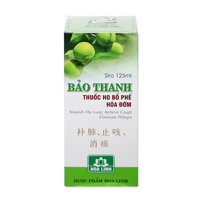 Thuốc ho Bảo Thanh là sản phẩm của Dược phẩm Hoa Linh, thành phần chính chứa dịch chiết của Xuyên bối mẫu và cao lỏng của hỗn hợp các dược liệu tự nhiên như: Tỳ bà diệp, Ô mai, Cam thảo, Sa sâm, Phục linh, Cát cánh, Mật ong,…. Sản phẩm dùng giảm các chứng ho do cảm lạnh, nhiễm lạnh, ho gió, ho khan, ho có đờm, ho do dị ứng thời tiết. Người bị phế âm hư gây ho dai dẳng lâu ngày, miệng họng khô, cổ họng ngứa, nóng rát, khản tiếng. Hỗ trợ điều trị viêm phổi, viêm họng, viêm phế quản.
