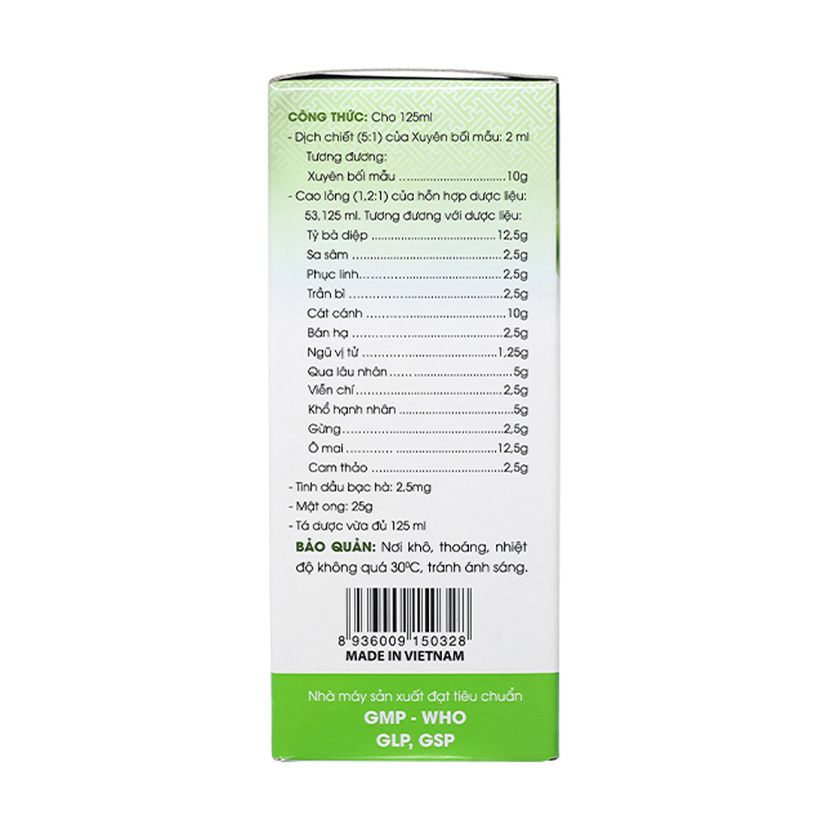 Ô mai 0.5 , Khổ hạnh nhân 0.2 , Viễn chí 0.1 , Ngũ vị tử 0.05 , Bán hạ (Thân, Rễ) 0.1 , Cát cánh 0.4 , Trần bì 0.1 , Phục Linh 0.1 , Sa sâm 0.1 , Tỳ bà diệp 0.5 , Xuyên bối mẫu 0.4