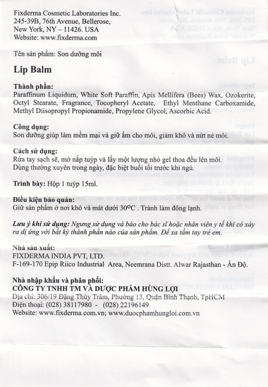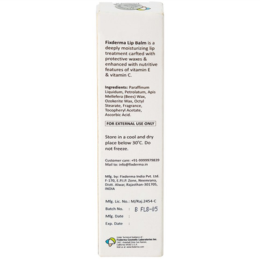 - Son dưỡng môi Fixderma Lip Balm với thành phần vitamin E và vitamin C giúp dưỡng ẩm sâu và bảo vệ đôi môi của bạn. Đồng thời, sản phẩm còn giúp làm mềm mại và giữ ẩm cho môi, giảm tình trạng môi bị khô, nứt nẻ.