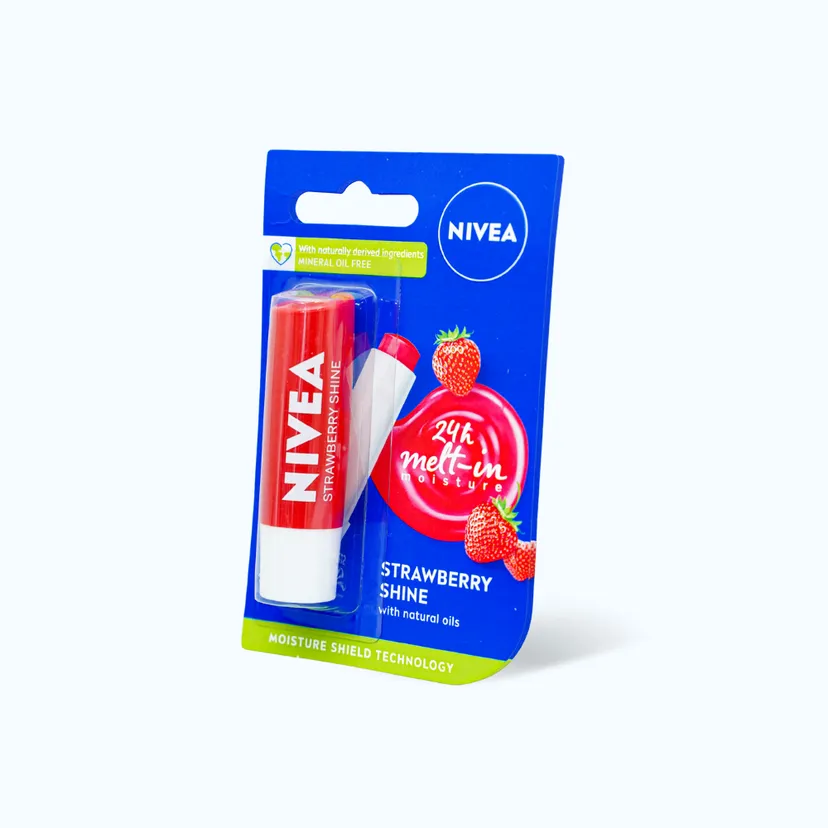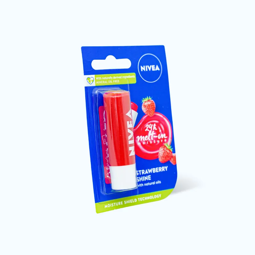 Son dưỡng ẩm Nivea Strawberry Shine Lip Balm là dòng sản phẩm chăm sóc môi đến từ thương hiệu mỹ phẩm Nivea xuất xứ từ Đức, có công thức không chứa chì an toàn cho làn da môi nhạy cảm, giúp cung cấp độ ẩm chuyên sâu giúp da môi luôn mềm mượt và mịn màng.