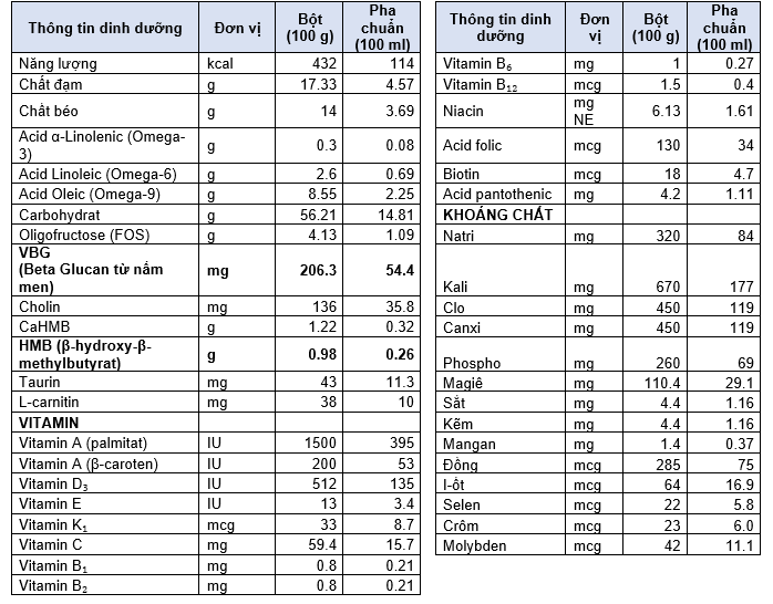 Tinh bột bắp thủy phân, DẦU THỰC VẬT (dầu hướng dương giàu oleic, dầu đậu nành, dầu hạt cải), sucrose, natri caseinat, đạm đậu nành tinh chế, oligofructose, đạm whey cô đặc, KHOÁNG CHẤT (kali citrat, tricanxi phosphat, magiê sulfat, magiê clorid, kali clorid, natri citrat, dikali phosphat, natri clorid, canxi carbonat, dimagie phosphat, kali hydroxid, sắt sulfat, kẽm sulfat, mangan sulfat, đồng sulfat, crôm clorid, kali iodid, natri molybdat, natri selenat), canxi β-hydroxy-β-methylbutyrat monohydrat (CaHMB), hương liệu vani tổng hợp, Beta Glucan từ nấm men (VBG), VITAMIN (acid ascorbic, ascorbyl palmitat, vitamin E, hỗn hợp tocopherol, canxi pantothenat, niacinamid, pyridoxin hydroclorid, riboflavin, thiamin hydroclorid, vitamin A palmitat, acid folic, beta caroten, phylloquinon, biotin, vitamin D₃, cyanocobalamin), cholin clorid, taurin, L-carnitin.
