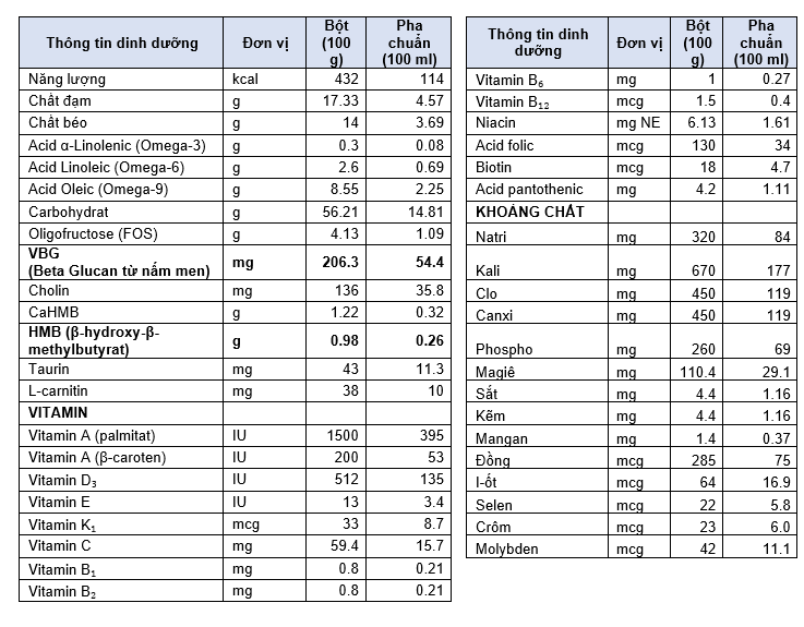 Tinh bột bắp thủy phân, DẦU THỰC VẬT (dầu hướng dương giàu oleic, dầu đậu nành, dầu hạt cải), sucrose, natri caseinat, đạm đậu nành tinh chế, oligofructose, đạm whey cô đặc, KHOÁNG CHẤT (kali citrat, tricanxi phosphat, magiê sulfat, magiê clorid, kali clorid, natri citrat, dikali phosphat, natri clorid, canxi carbonat, dimagie phosphat, kali hydroxid, sắt sulfat, kẽm sulfat, mangan sulfat, đồng sulfat, crôm clorid, kali iodid, natri molybdat, natri selenat), canxi β-hydroxy-β-methylbutyrat monohydrat (CaHMB), hương liệu vani tổng hợp, Beta Glucan từ nấm men (VBG), VITAMIN (acid ascorbic, ascorbyl palmitat, vitamin E, hỗn hợp tocopherol, canxi pantothenat, niacinamid, pyridoxin hydroclorid, riboflavin, thiamin hydroclorid, vitamin A palmitat, acid folic, beta caroten, phylloquinon, biotin, vitamin D₃, cyanocobalamin), cholin clorid, taurin, L-carnitin.